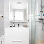 بالإضافة إلى وسائل الراحة مثل ضاغط السراويل ومكيف الهواء، يتميز التصميم الداخلي أيضًا بتلفزيون البث الأرضي لإقامة ممتعة. كما تمّ تجهيز الشقة بالصالون ومكتب العمل. تتوفّر أسرّة مع الوسائد الزغبية المضادة للحساسية تحت تصرف الضيوف. استمتع براحة الحمام في مكان الإقامة المزوّد بمجفف الشعر وملاءات الحمام والمناشف. كما يمكن العثور على الدوش.
